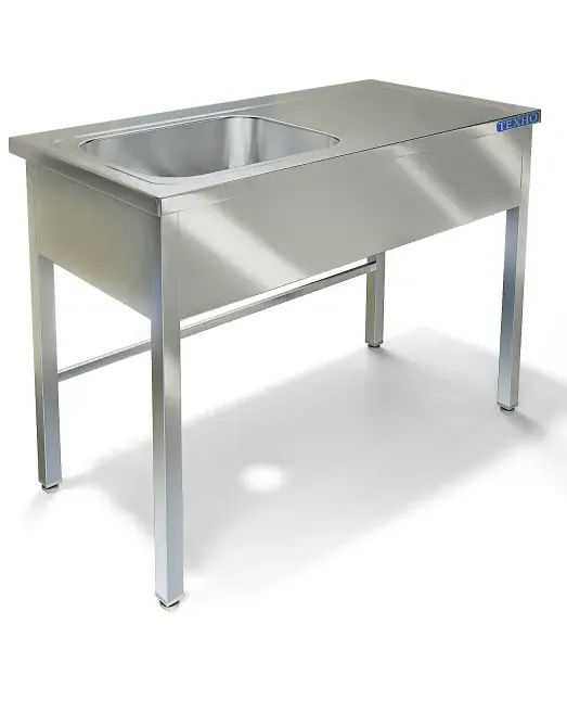 Стол производственный без борта с ванной моечной расположенной слева. Столешница из нержавеющей стали марки AISI 304 толщиной 1мм. Каркас сварной из трубы 40х40 нержавеющей стали марки AISI 304 толщиной 1,2мм. Одна цельнотянутая емкость размером 500х400х250 из нержавеющей стали марки AISI 304 толщиной 1мм. Фартук с трех сторон из нержавеющей стали марки AISI 430 толщиной 0,8мм. Регулируемые опоры. Стол поставляется в собранном виде.