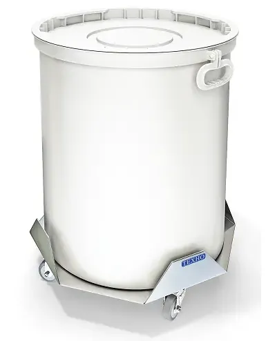 Тележка с пластмассовым баком под отходы. Платформа из нержавеющей стали марки AISI 430 толщиной 2мм. Бак пластмассовый 52 литра. Поставляется без ручки. Колесо диаметром 50мм поворотное, грузоподъемность 50кг. Тележка поставляется в собранном виде.