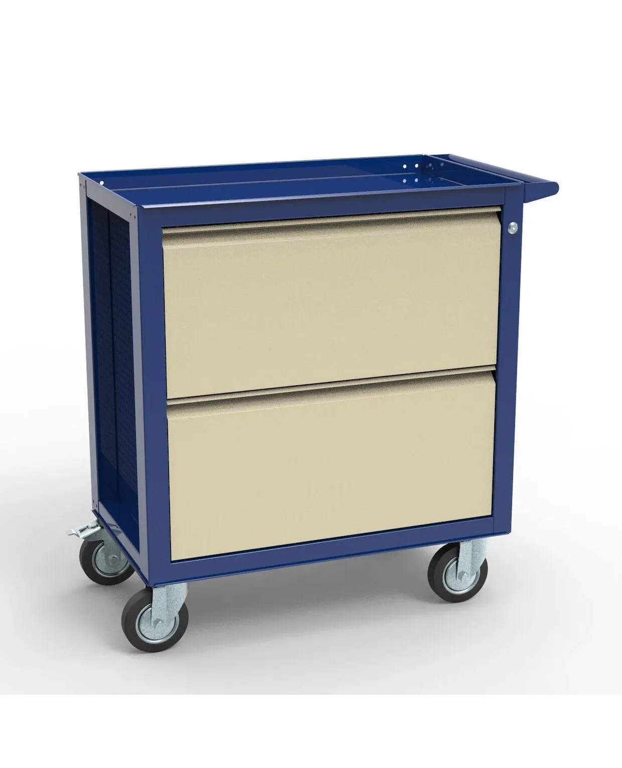 Ключевые особенности модели продуманы до мелочей. Прочное металлическое основание и долговечное порошковое покрытие обеспечивают устойчивость к нагрузкам и износу. Тележка обладает солидной грузоподъемностью, а ее габариты - высота 855 мм, глубина 440 мм, ширина 825 мм оптимизированы для маневренности в ограниченном пространстве. Четыре колеса диаметром 125 мм гарантируют плавный и легкий ход даже по неровным поверхностям. Элегантный цвет Синий (RAL 5002), серый (RAL 7032) делает ее не только функциональной, но и визуально приятной.